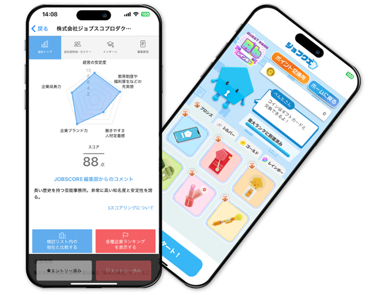 はじめての方へ 企業をみつける 会社説明会・セミナーをみつける インターンをみつける 職場見学会をみつける 求人情報をみつける スコアの見方 ジョブクエについて 転職・就職お役立ち情報 転職・就職お役立ち動画 会員登録無料 ログイン