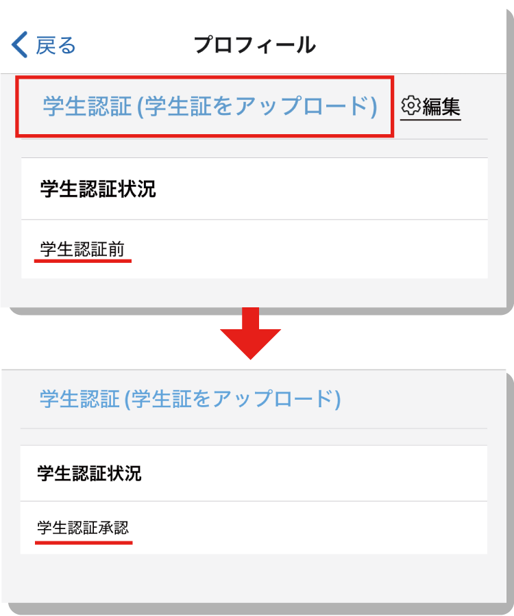 事務局にて確認が取れましたらステータスが【学生認証前】から【学生認証承認】へと変わります。
