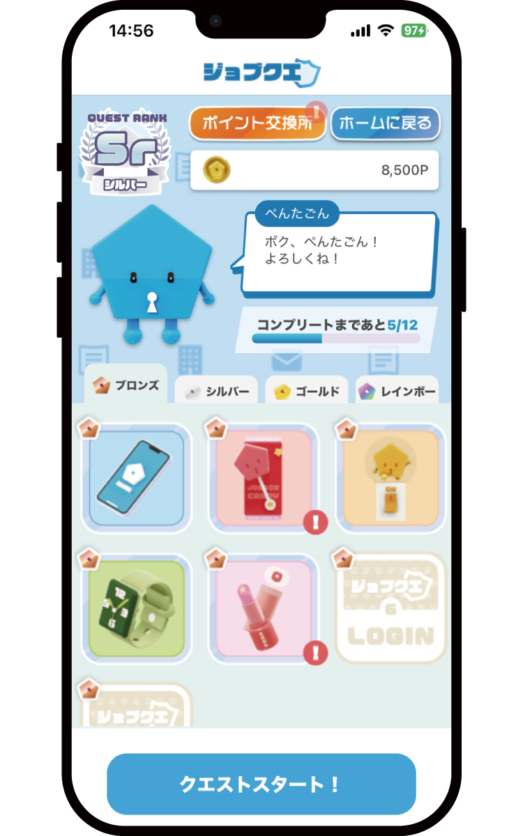 「自宅で企業を知らべる時間」や「就活系学習動画を見る時間」、「気になる企業の説明会に行く時間」など、クエスト化さた就職活動をクリアするたびにポイントが付与されます。